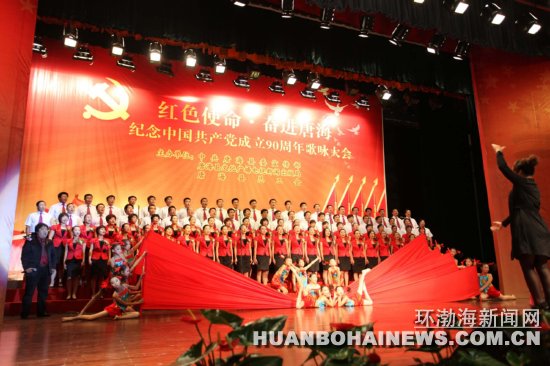 日前,唐海县举行了以“红色使命、奋进唐海”为主题的纪念中国共产党成立90周年歌咏大会活动。全县19个代表队共1600人演唱了20多首脍炙人口的红色经典歌曲,共同讴歌今天的幸福生活,表达对党和祖国的热爱之情。