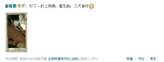 萧敬腾发微博诉苦 打完针赶飞机引粉丝心疼