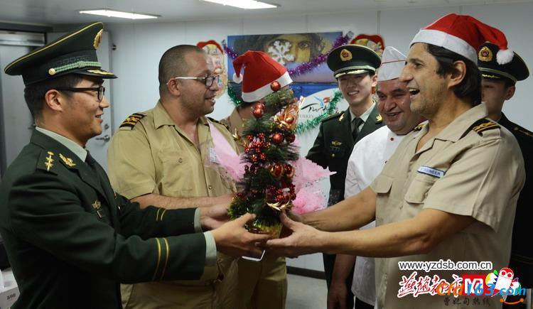 12月23日,为了使外籍船员在曹妃甸口岸度过一个愉快的圣诞节,河北公安边防总队曹妃甸边防检查站检查员登轮为外籍船员办理出入境手续时,送去了圣诞礼物,带去了边防官兵的圣诞祝福。曹妃甸边防检查站检查员焦贵森(左一)为外籍船员送上圣诞礼物。通讯员王小雪/摄