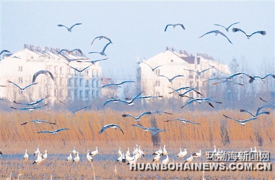 随着天气转冷,曹妃甸湿地迎来候鸟的迁徙高峰,东方白鹳、天鹅、豆雁、白额雁、灰雁、白琵鹭、苍鹭等大型水鸟纷至沓来,在湿地中觅食为迁往南方越冬地补充能量。在鸟类迁徙大军中,400多只国家一级保护动物东方白鹳格外引人注目,它们时而低头觅食,时而又集体起飞,形成冬日湿地独特风景线。