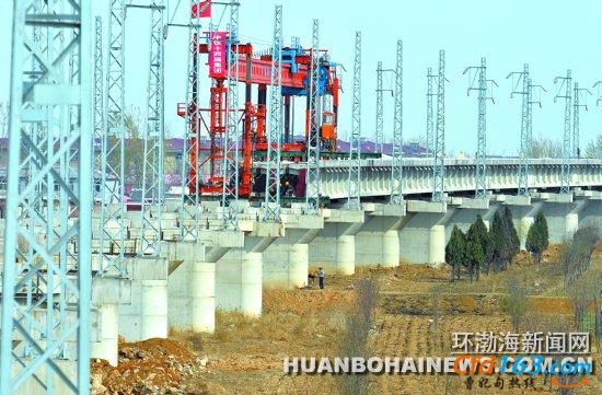 4月1日上午,中铁十四局五公司员工正在位于唐山杨信庄村的张(张家口)唐(曹妃甸)铁路架桥工地上施工。截至当日,总长度近2000米的杨信庄段桥梁架设工作已经完成过半,即将进行路轨铺设。