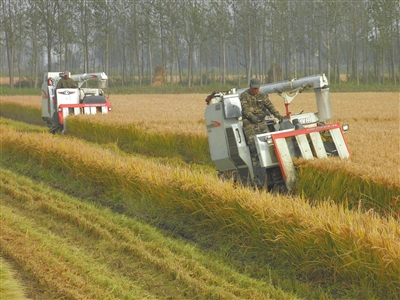 图为10月13日下午该场北常坨村农工常有正在收割水稻。